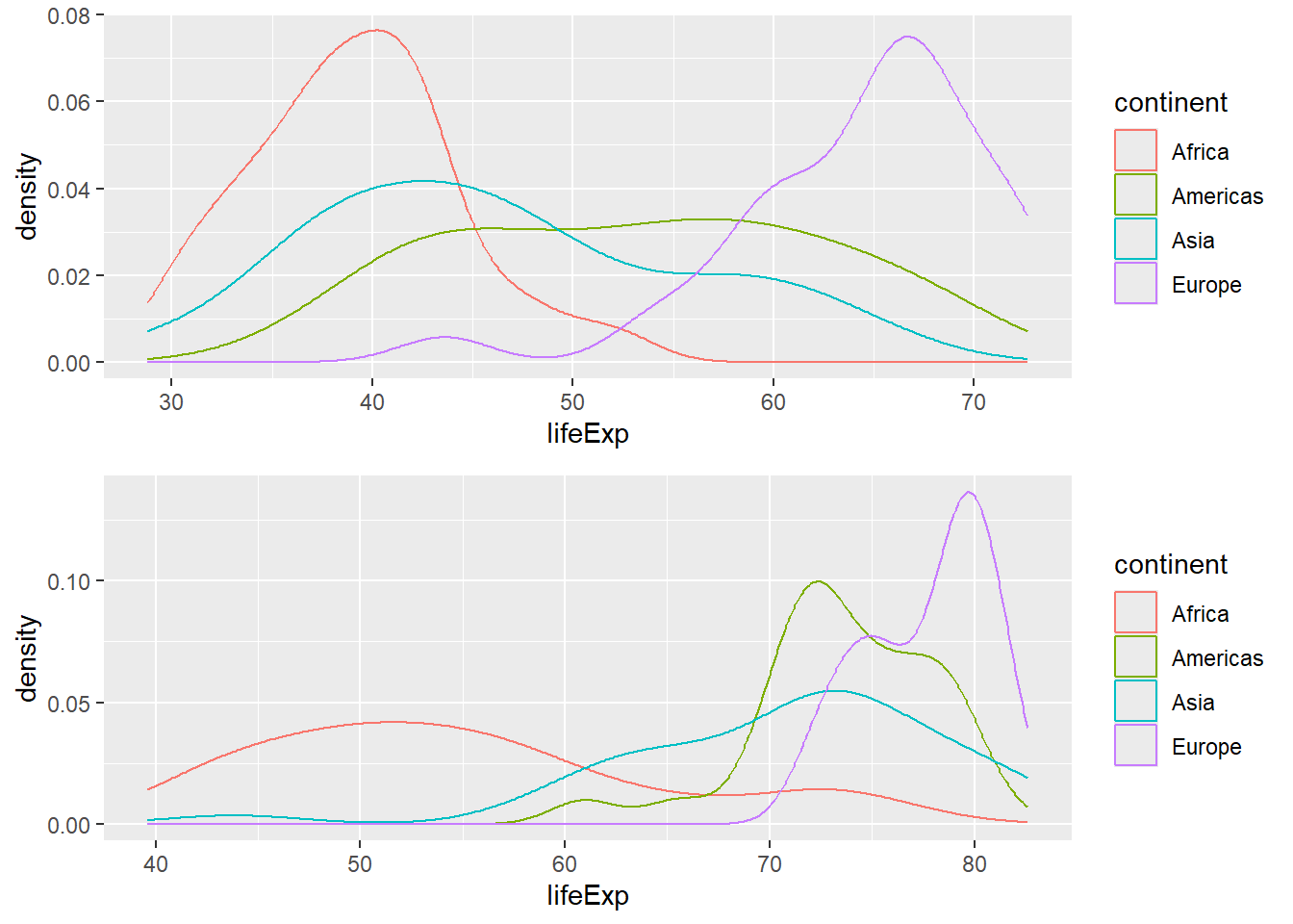 p2 <- ggplot(filter(gapminder, year==1952 & continent!="Oceania"), aes(x = lifeExp, color = continent)) + geom_density()