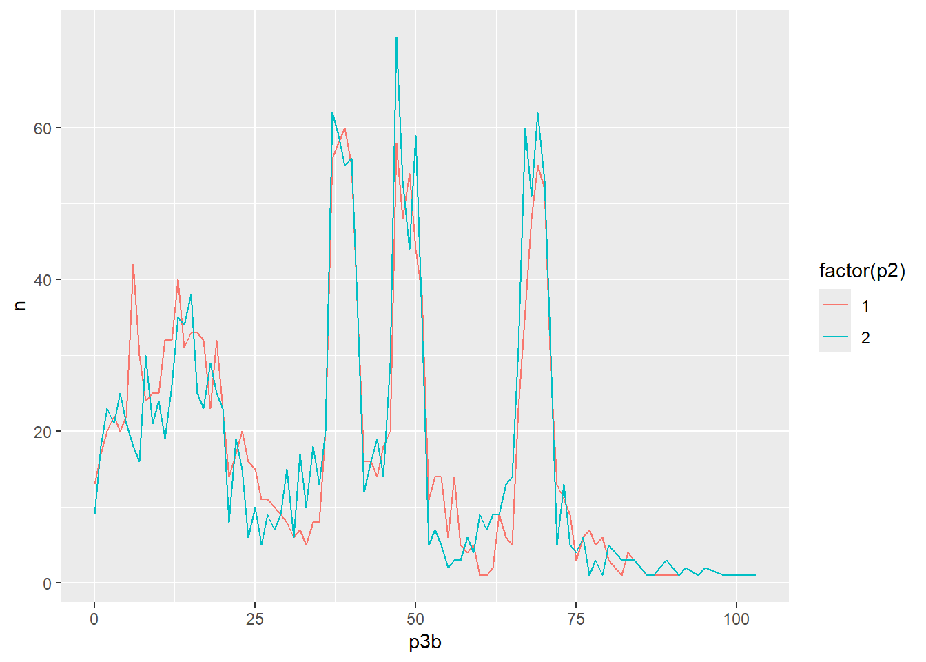 ggplot(aes(x = p3b, y = n, color = factor(p2))) + # estética