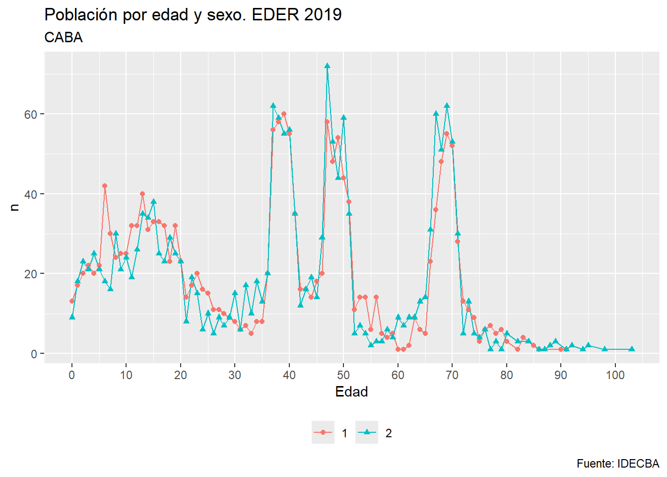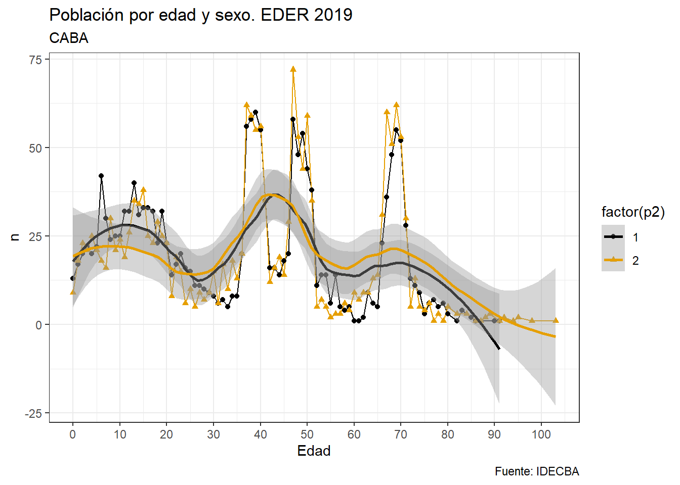 Vamos a ver la distribución por edad de la EDER con ggplot. Para eso, primero vamos a calcular cuántas personas hay por edad. Recordemos que hay un código 9999 para valores desconocidos de edad